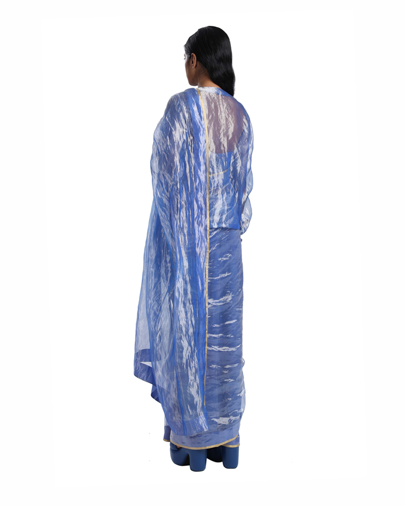 An iconic expression of AKAARO’s textile philosophy, this metallic saree is engineered to move like liquid metal. Woven to achieve a molten bluesurface, the fabric reflects light in continuous fluid motion—smooth, luminous, and sculptural. Neither flat nor rigid, the saree drapes with effortless flow, creating a powerful yet understated statement.
