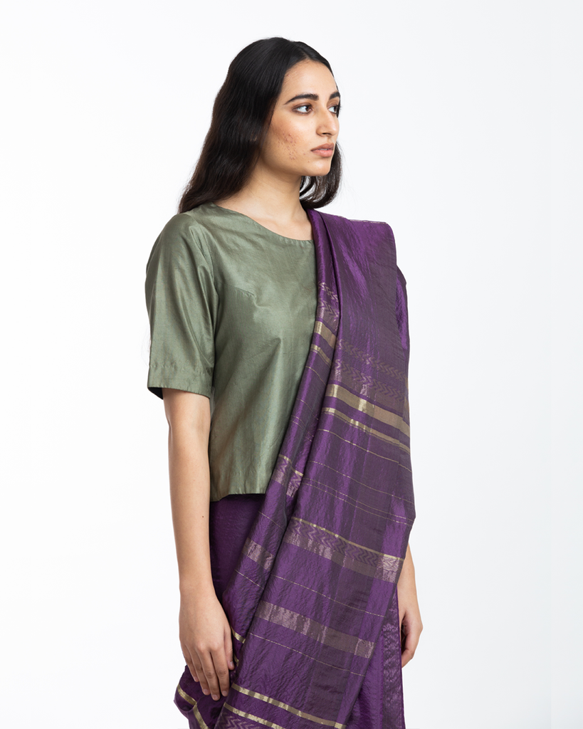 A contemporary silk saree woven with fine zari accents, offering a light, breathable drape with a subtle sheen. Designed for effortless elegance, it transitions seamlessly from day occasions to intimate evenings.