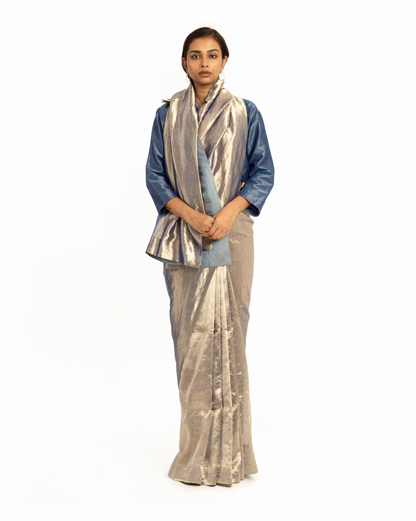 An iconic expression of AKAARO’s textile philosophy, this metallic saree is engineered to move like liquid metal. Woven to achieve a molten gold surface with texture, the fabric reflects light in continuous fluid motion—smooth, luminous, and sculptural. Neither flat nor rigid, the saree drapes with effortless flow, creating a powerful yet understated statement.