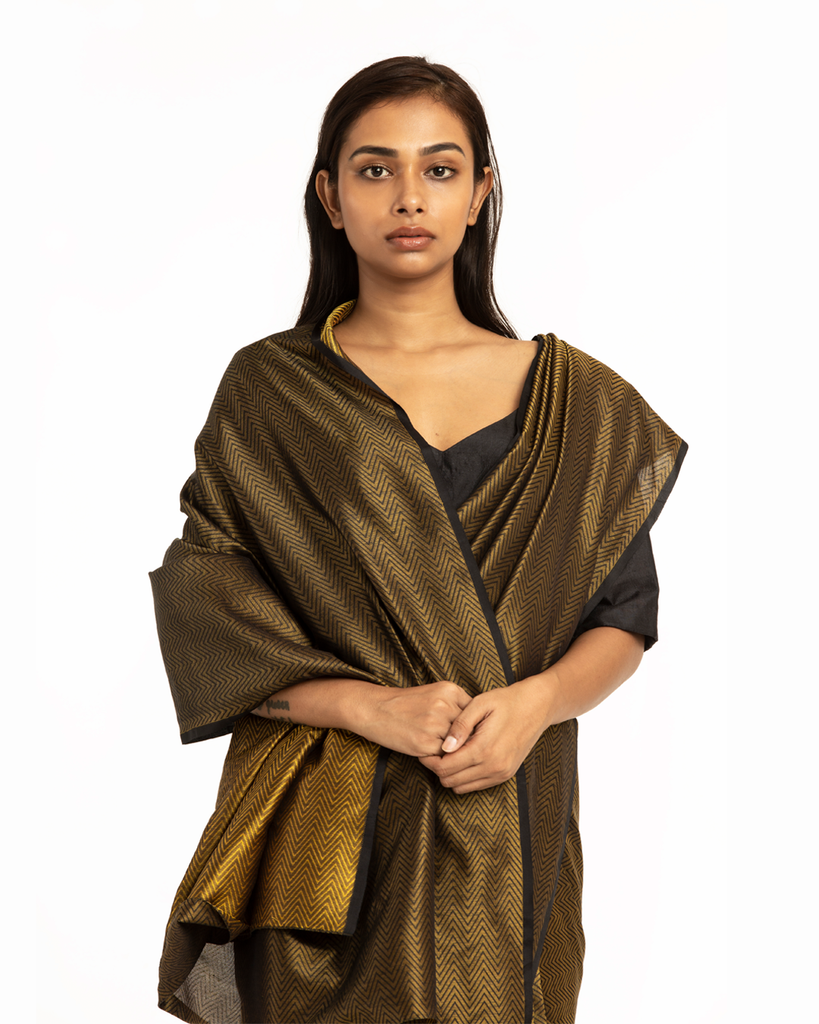 Handwoven silk saree in gold and black, featuring a chevron weave that blends graphic rhythm with fluid elegance.