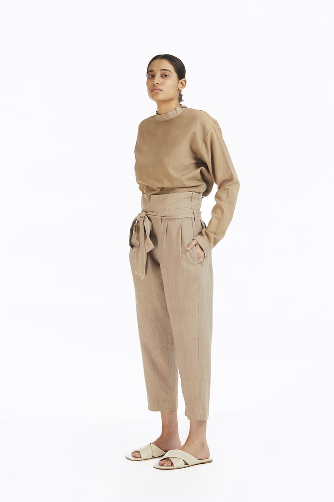 Handwoven in handspun cotton ,these trousers features a bow-belted waist which makes for an easy and comfortable wear. the khaki colour makes it have a universal appeal. Made with handspun Cotton and hand woven in Rajasthan , India.