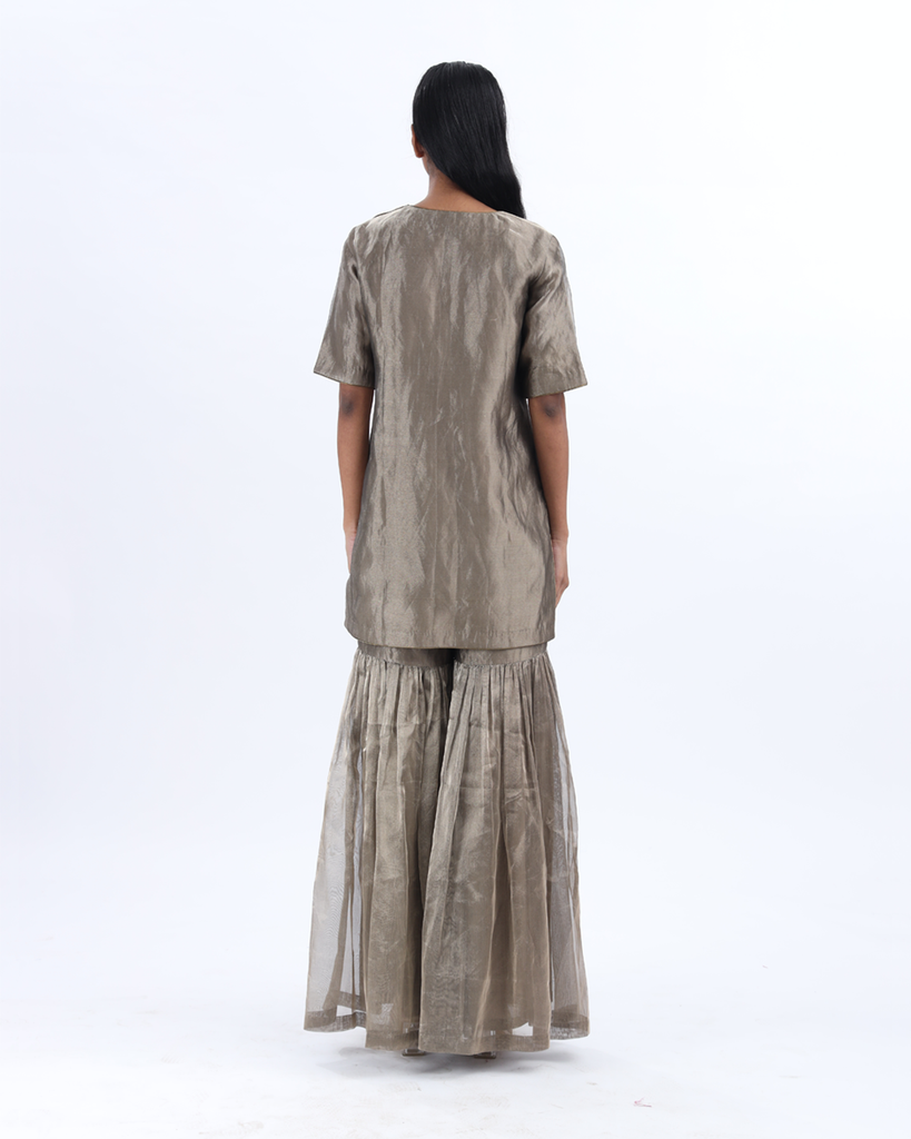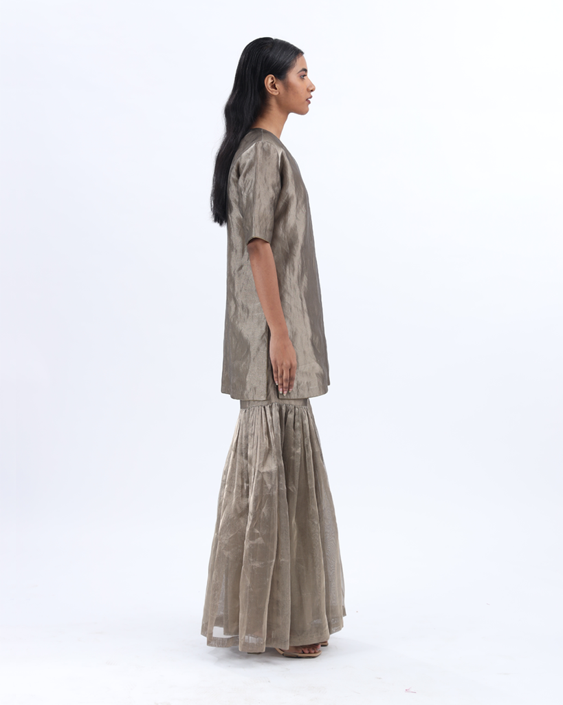 Handwoven grey silk zari sharara set paired with a metallic striped silk dupatta, combining understated elegance with luminous detail.